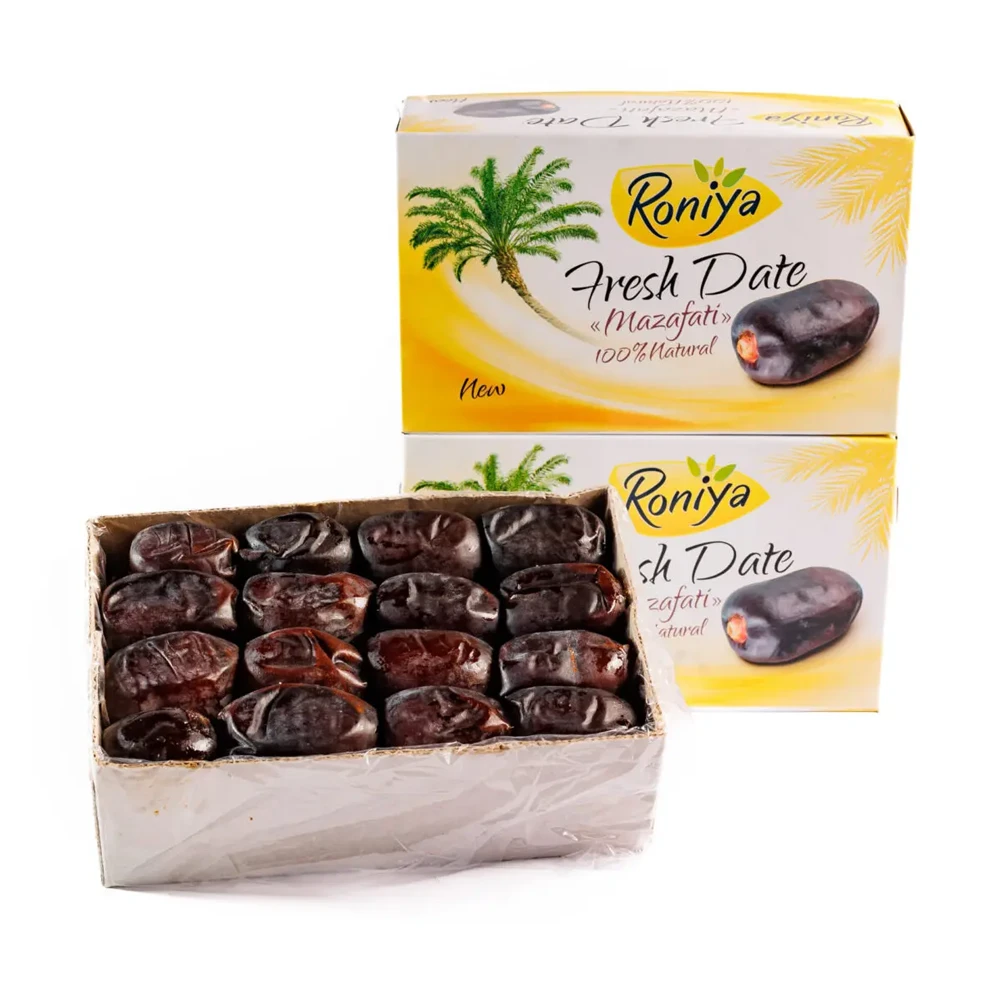 Фініки сорту Мазафаті — це великі, соковиті плоди темно-фіолетового або чорного кольору, відомі своїм ніжним ароматом та карамельним смаком. Вирощені в Ірані, вони є одними з найпопулярніших фініків завдяки своїм високим смаковим якостям та природній солодкості.