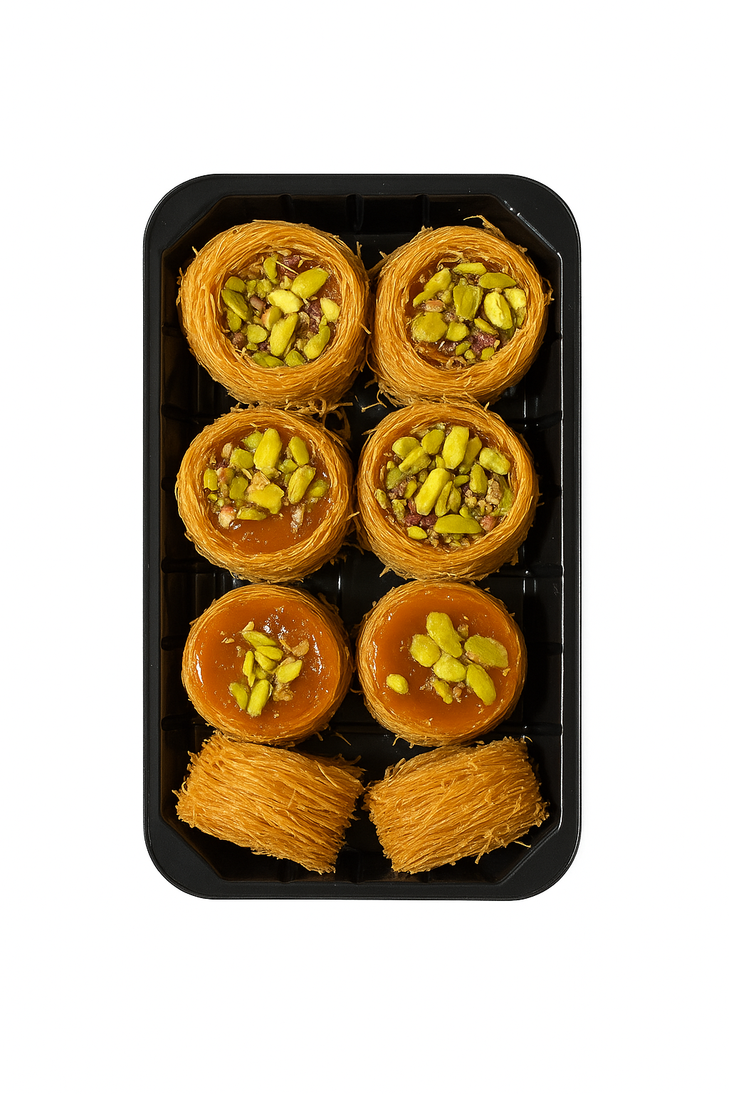 Катаіфі — це традиційний східний десерт, виготовлений із тонкого тіста, що нагадує тонкі нитки, які ніжно обволікають кремову начинку з горіхів. Поєднання ніжного тіста, насиченого крему та пікантного горіхового смаку створює справжню гармонію смаку, яка перенесе вас у світ східних солодощів.