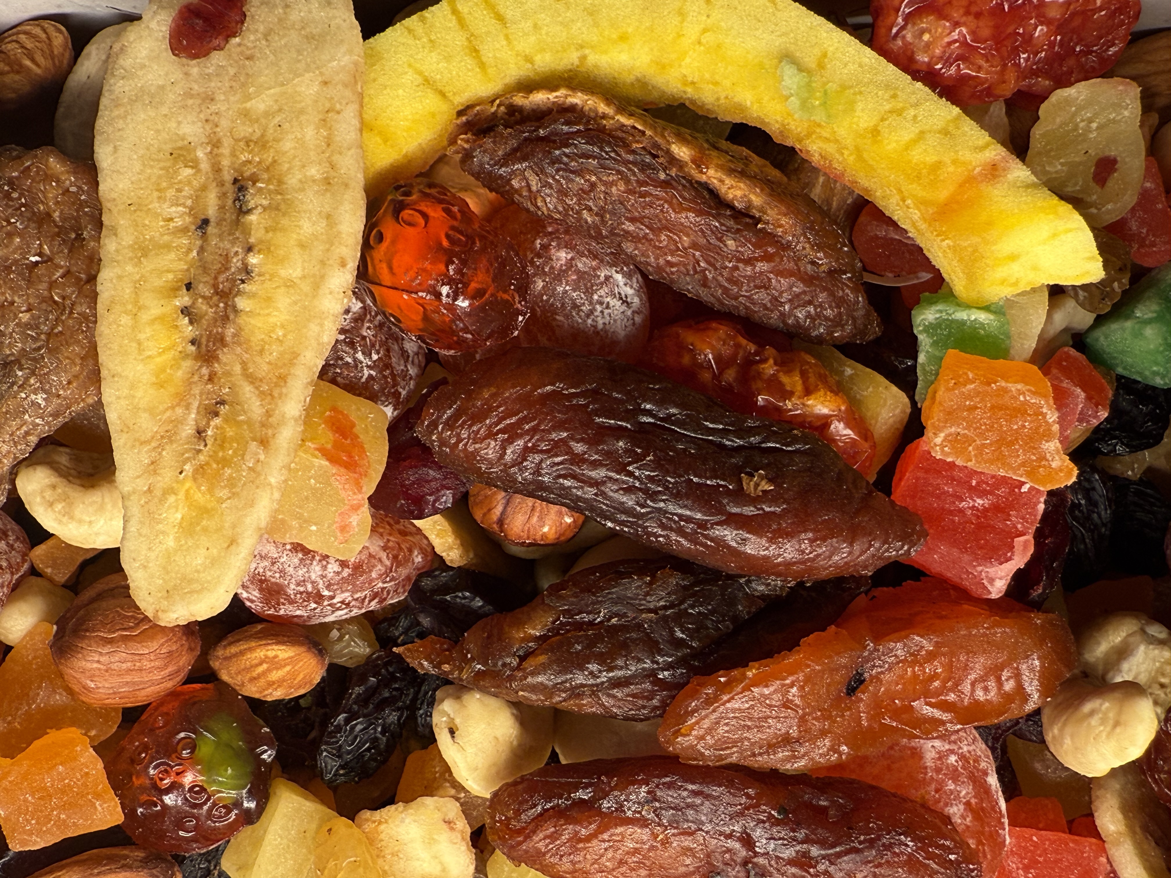 У складі: • ніжний кеш’ю • хрусткий мигдаль • поживний фундук • ароматні бананові чипси • пікантний в’ялений томат • освіжаюче помело • екзотичний кумкват • кисло-солодка журавлина • два види родзинок • фруктові желейки • яскраві цукати