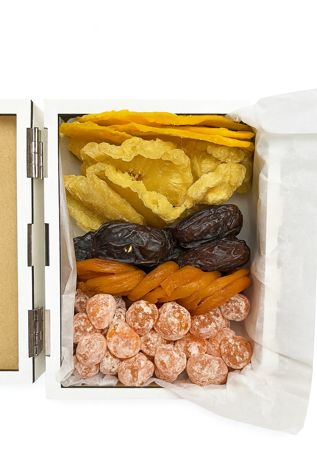 • Святкова та акуратна упаковка • Добірні сухофрукти преміум-якості • Готовий подарунок без необхідності додаткового оформлення • Підходить і дорослим, і дітям • Гармонійний баланс солодкого, тропічного та цитрусового смаку