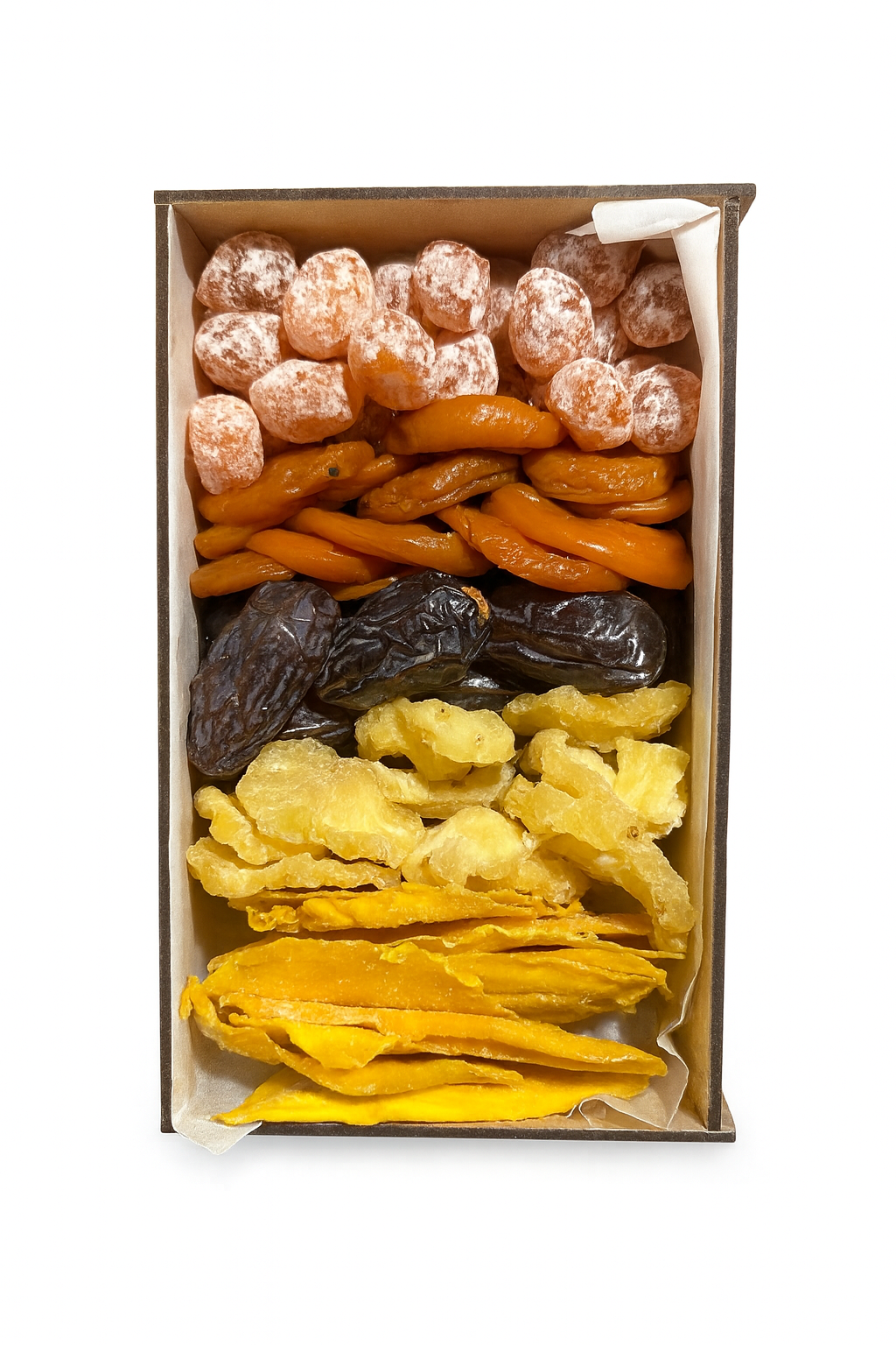 Усередині — гармонійне поєднання натуральних і цукатованих фруктів, які дарують яскравий смак, користь і задоволення. Такий набір поєднує в собі турботу, естетику та справжню насолоду від кожного шматочка.