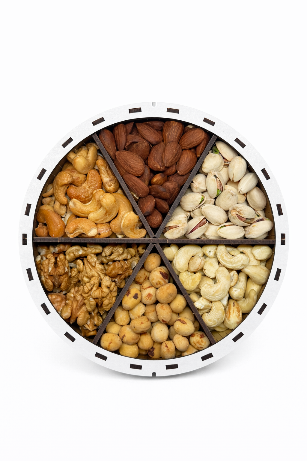 Завдяки зручному поділу на секції кожен вид горіхів зберігає свій смак та аромат, а набір виглядає ефектно та дорого. Це поєднання користі, естетики та натуральної енергії.